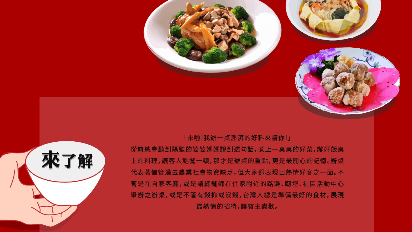 辦過的宴席不計其數,婚喪喜慶各種活動指定的明星總鋪師 40多年來一家十三口齊心投入辦桌事業 靠著「呷好道相報」本著老師父的精神和執著 讓辦桌有老味、有新意,堅信「俗擱有力」才有的隨性人情味 底迦 |